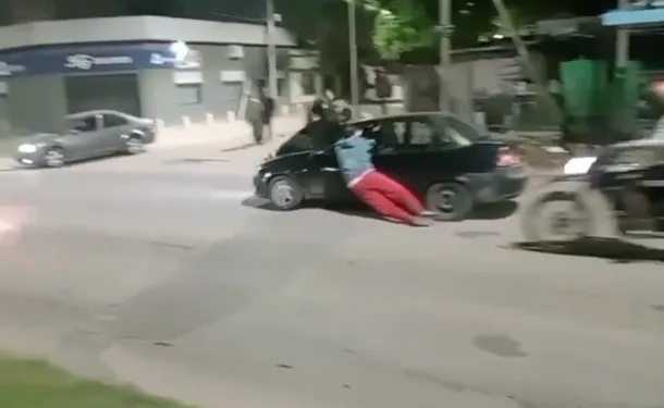 El incidente ocurrió en Avenida Hudson y Río Turbio. En las imágenes difundidas por Data Judicial se observa cómo el auto avanza varios metros con las dos personas colgando.