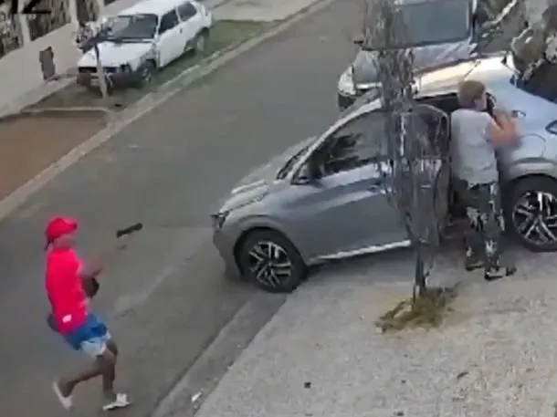 Tal como se observa en el video, uno de los delincuentes, vestido con una remera y gorra roja y una bermuda de jean, bajó de la moto y les apuntó con un arma.