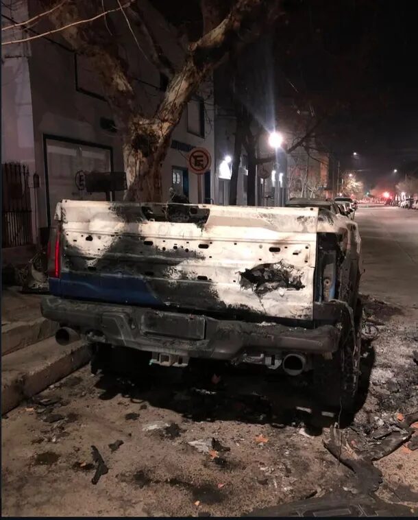 En imágenes captadas por cámaras de seguridad de la zona se observa a encapuchados rociaron con nafta y prendieron fuego la camioneta Ford Ranger Raptor, que ardió en cuestión de minutos y quedó en estado de destrucción total.