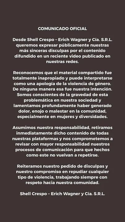 En su comunicado, la firma asumió su responsabilidad y lamentó «profundamente haber generado dolor, enojo o malestar en la comunidad». Reconocieron que el video «puede interpretarse como una apología de la violencia de género» y aseguraron que «de ninguna manera esa fue nuestra intención».